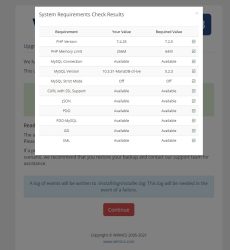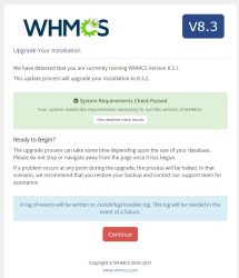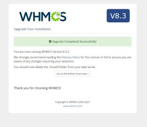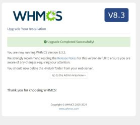 Al correr actualización a la versión V8.3 de WHNCS, realiza bien todo el proceso, al finalizar presenta pantalla de terminar todo ok incluida la revisión de sistema, al dar click en el botón para ir al Admin es cuando presenta el error, como si todavía estuviera instalando la actualización (Ver imágenes anexas.)