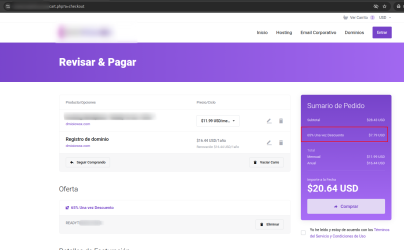 * Creé en WHMCS un cupón y lo apliqué producto así: https://midominio.com/cart.php?a=add&pid=6&billingcycle=monthly&promocode=NOMBREDEMICUPON