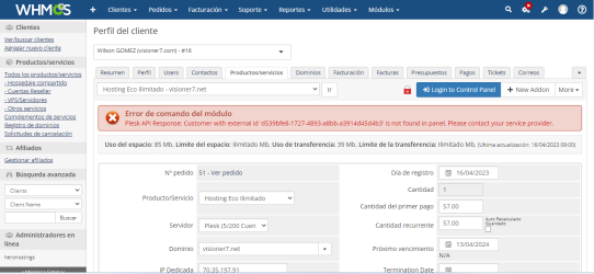 Buenas noches no me està sincronizando correctamente las cuentas que eh creado en plesk con whmcs